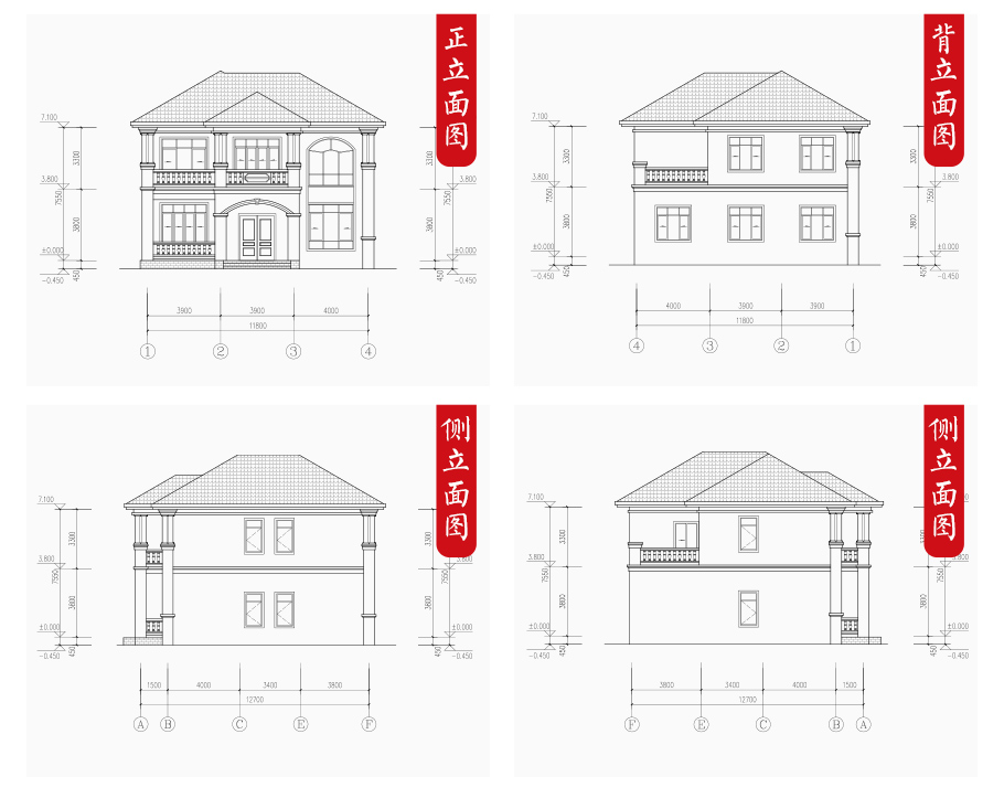 | 建筑圖: | 建筑平面圖:一層平面圖,二層平面圖; 建筑立面圖:東立面圖,西立面圖,南立面圖,北立面圖,剖面圖; 大樣圖:樓梯詳圖,細部大樣,門窗大樣 |