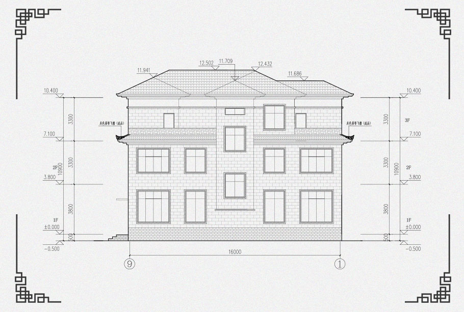 建筑立面圖:東立面圖,西立面圖,南立面圖,北立面圖,剖面圖;