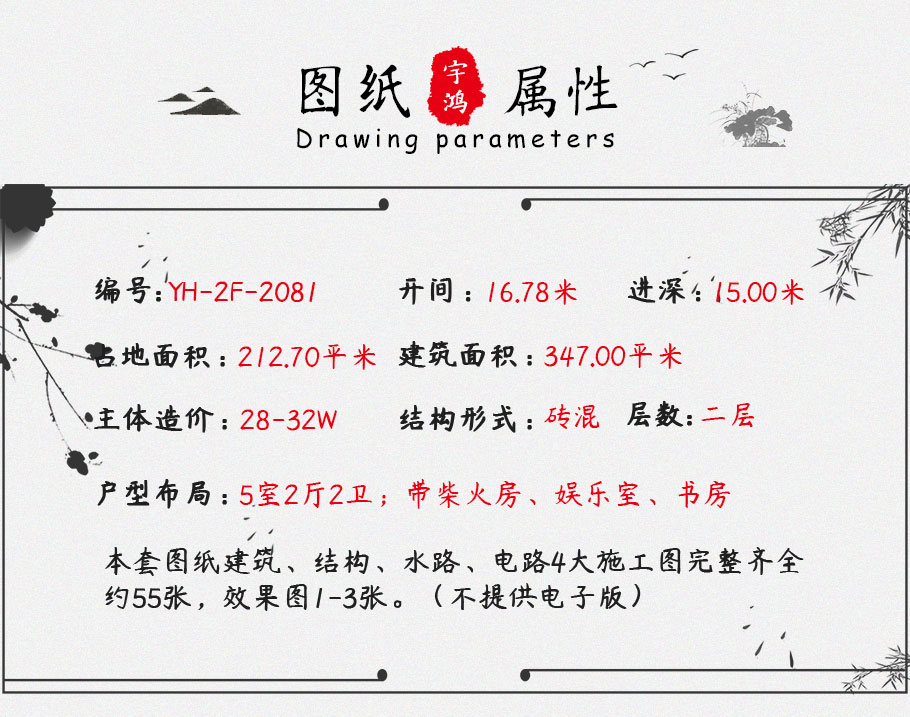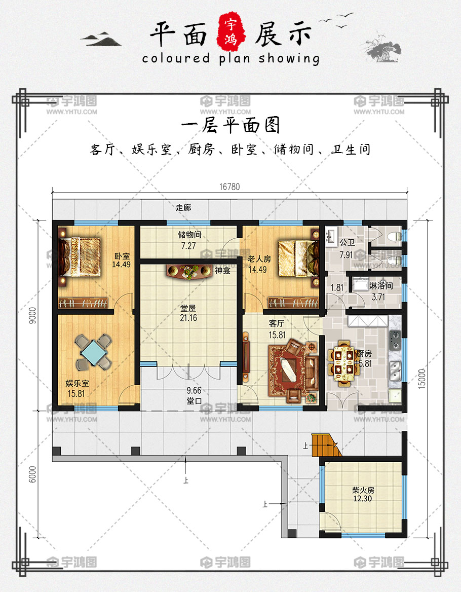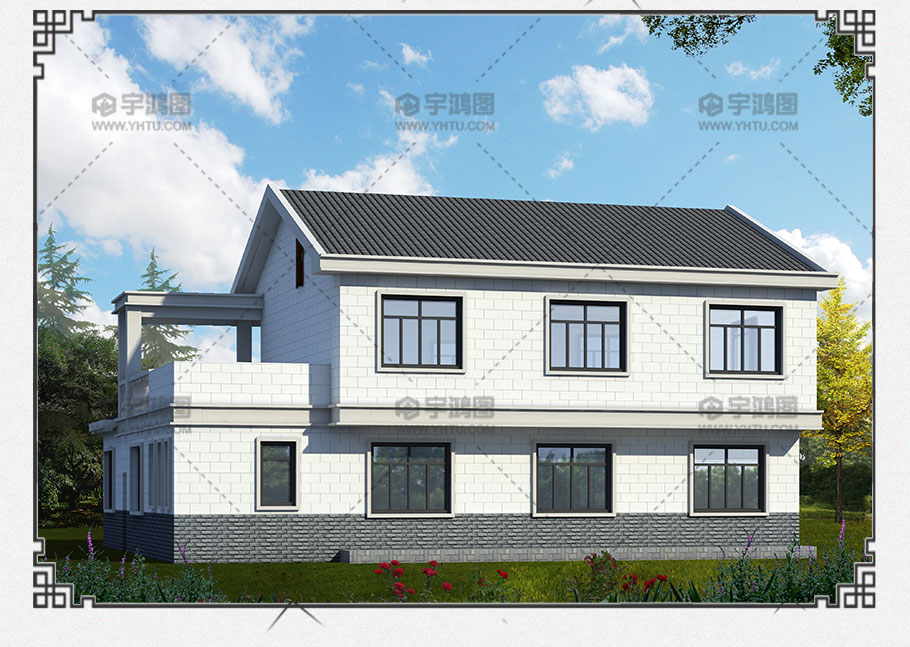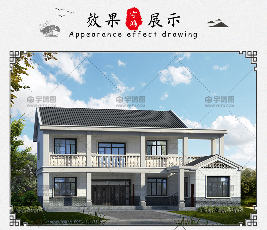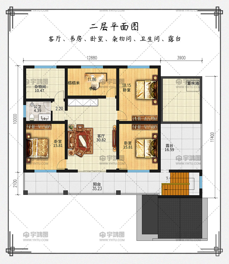 帶柴火房二層中式農(nóng)村房屋設計圖,設有堂屋和神龕。一層東南角設有12.3平方米柴火房,從堂口前方進入帶神龕的獨立堂屋,堂口右側連接客廳,老人房位于客廳上方,儲物間東側與老人房相連,又與北側走廊相連。堂屋左側有一個娛樂室和臥室。客廳右側有16平米廚房餐廳通間,還有淋浴間和公衛(wèi)。二層有3個臥室,一個客廳,一個書房,一個儲物間。外帶一個蓄水池,35.2平米大陽臺和16.6平方米露臺,此款是農(nóng)村人鐘愛的戶型設計圖。