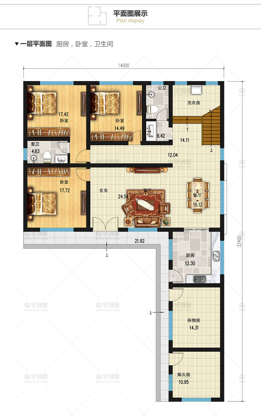 二層帶柴火房農村平頂自建房設計圖紙及效果圖。房子外觀時尚現代,戶型為倒“L”字形,一層戶型為三個臥室,一個餐客廳通間,客廳帶玄關,樓梯間有洗衣房,主臥帶套衛,柴火房,雜物房,廚房一字排開,并與餐廳相連,特別適合習慣傳統做菜方式的農村家庭。二層為3個臥室,一個家庭廳和一個茶室,主臥套房帶套衛和衣帽間。茶室外連接70平米超大露臺,品茶賞景,生活愜意。