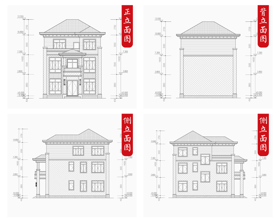 建筑立面圖:東立面圖,西立面圖,南立面圖,北立面圖,剖面圖;