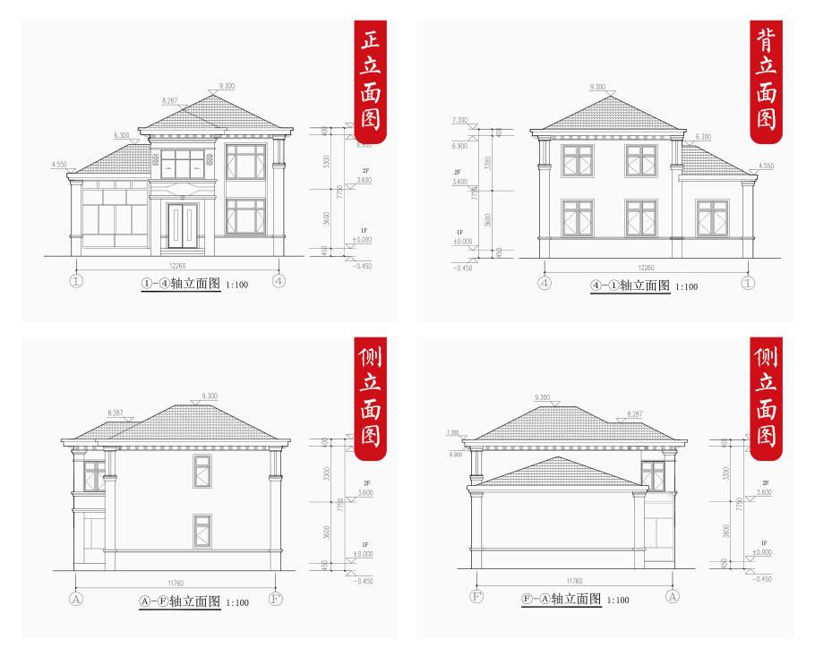 建筑立面圖:東立面圖,西立面圖,南立面圖,北立面圖,剖面圖;
