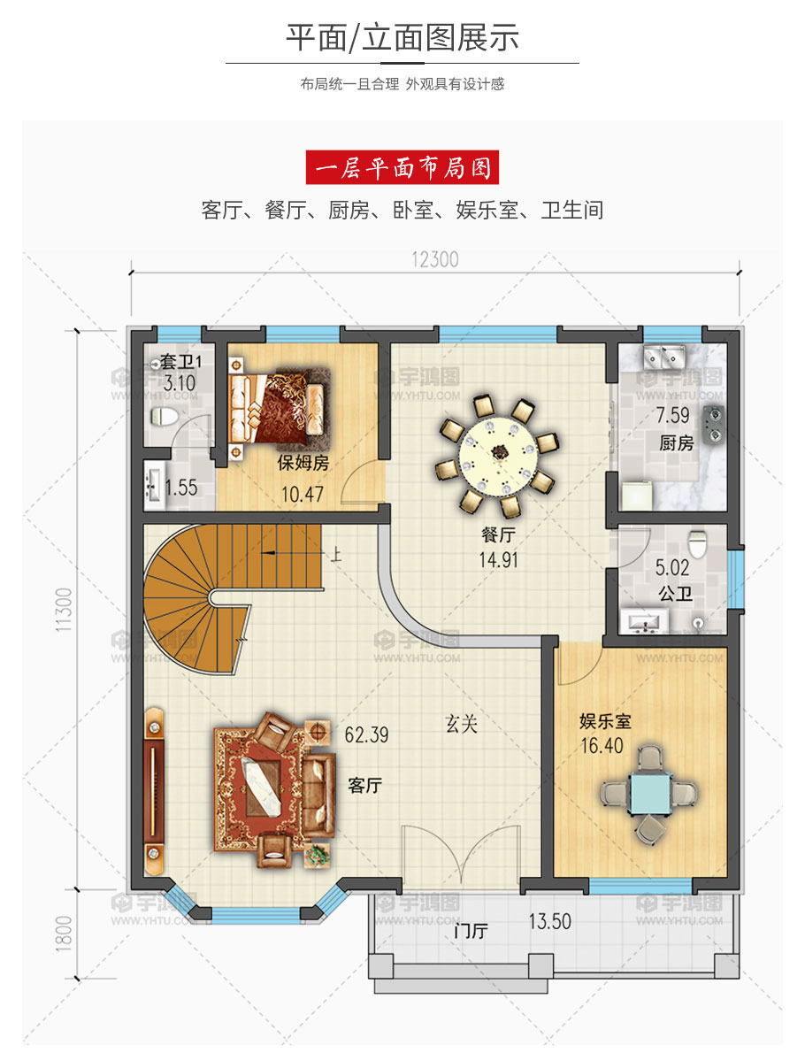| 開間:12.3米 | 進深:13.1米 | 占地面積:140.8平方米 | 建筑面積:288.7平方米 |