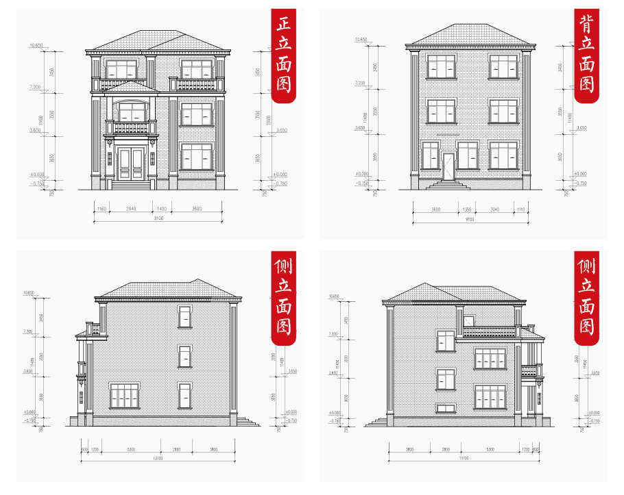 建筑立面圖:東立面圖,西立面圖,南立面圖,北立面圖,剖面圖;