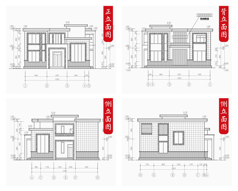 建筑立面圖:東立面圖,西立面圖,南立面圖,北立面圖,剖面圖;