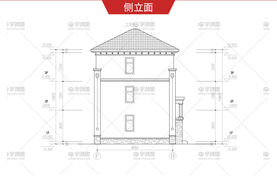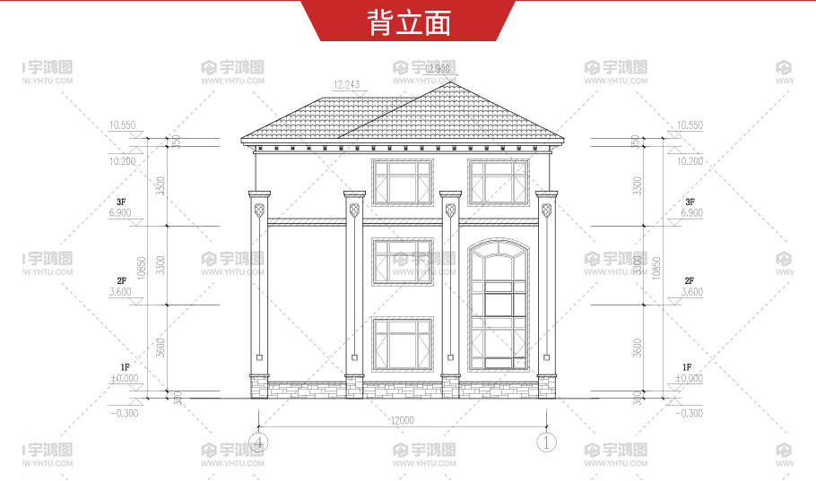 | 風格:歐式 | 層數:三層 | 結構形式:磚混結構 | 圖紙編號:YH-A-3122 |