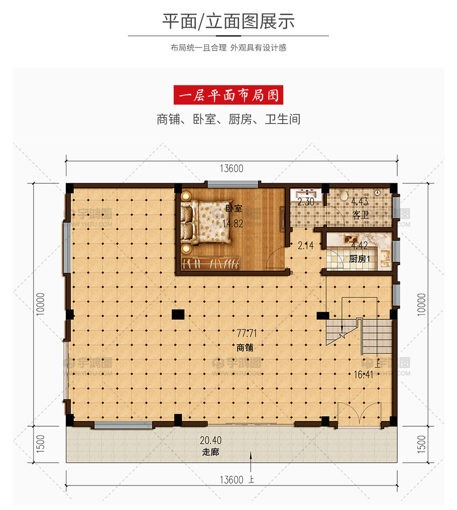 | 開間:13.6米 | 進深:11.5米 | 占地面積:156.4平方米 | 建筑面積:694平方米 |