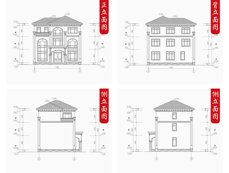 建筑立面圖:東立面圖,西立面圖,南立面圖,北立面圖,剖面圖;