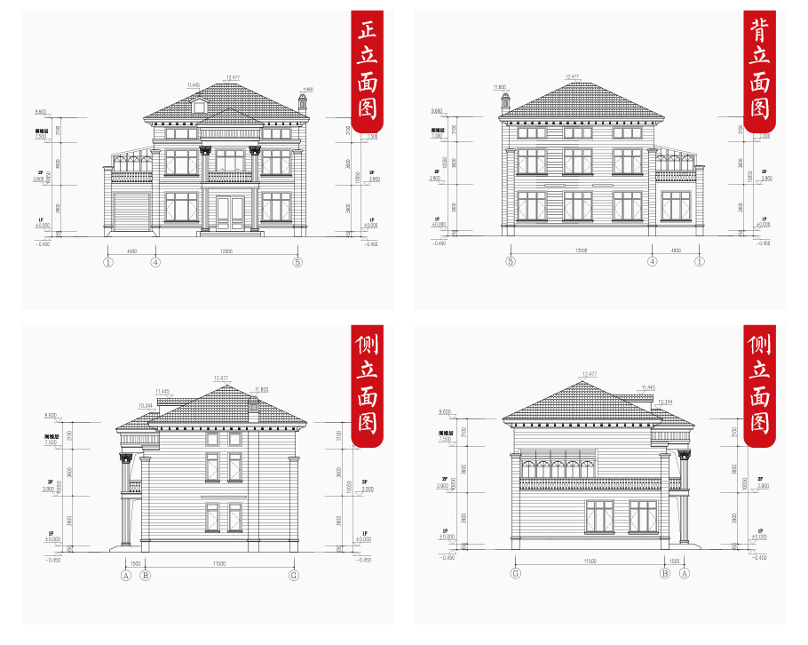 | 建筑圖: | 建筑平面圖:一層平面圖,二層平面圖; 建筑立面圖:東立面圖,西立面圖,南立面圖,北立面圖,剖面圖; 大樣圖:樓梯詳圖,細部大樣,門窗大樣 |