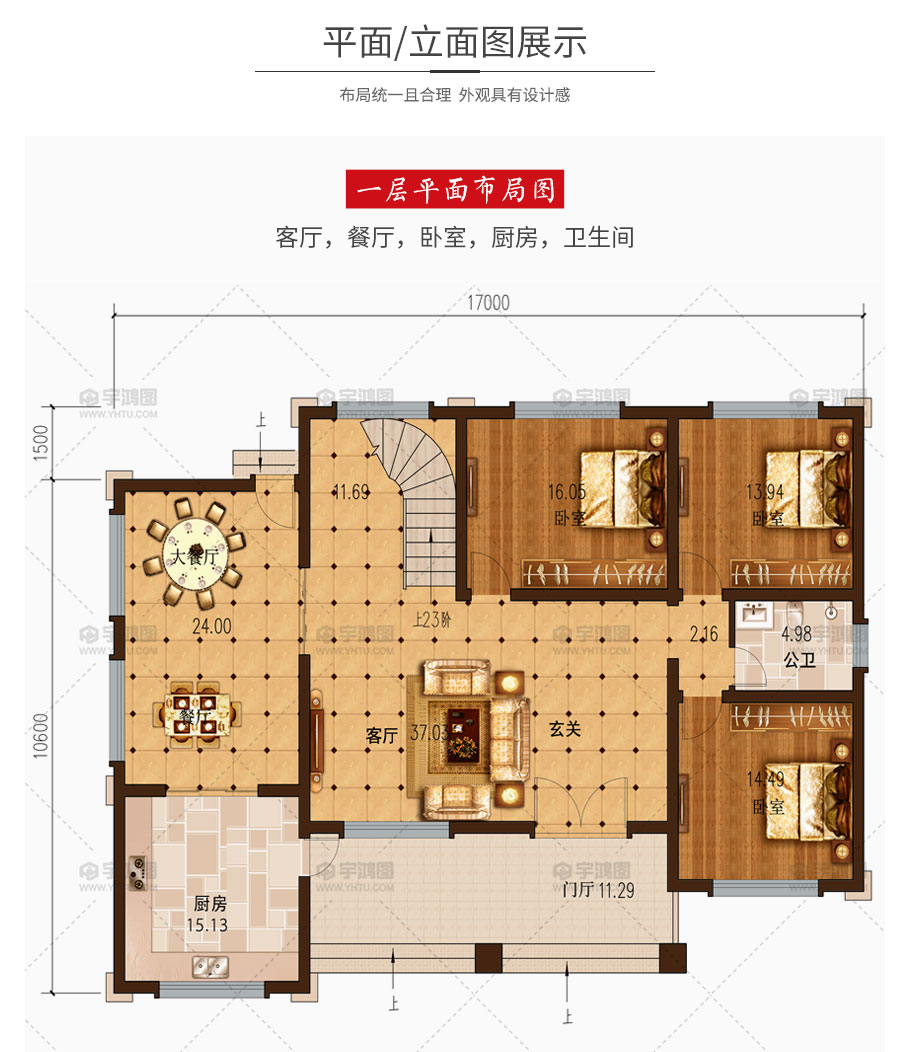 | 開間:17米 | 進深:12.1米 | 占地面積:163.3平方米 | 建筑面積:308平方米 |