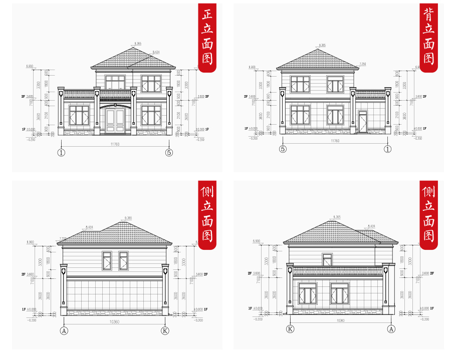 建筑立面圖:東立面圖,西立面圖,南立面圖,北立面圖,剖面圖;