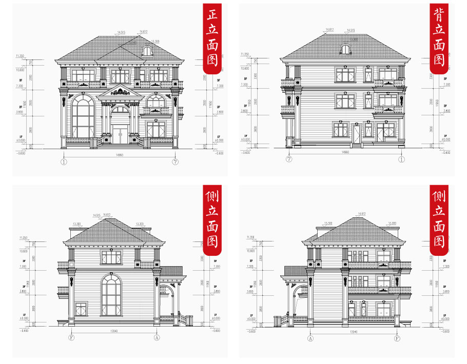 建筑立面圖:東立面圖,西立面圖,南立面圖,北立面圖,剖面圖;