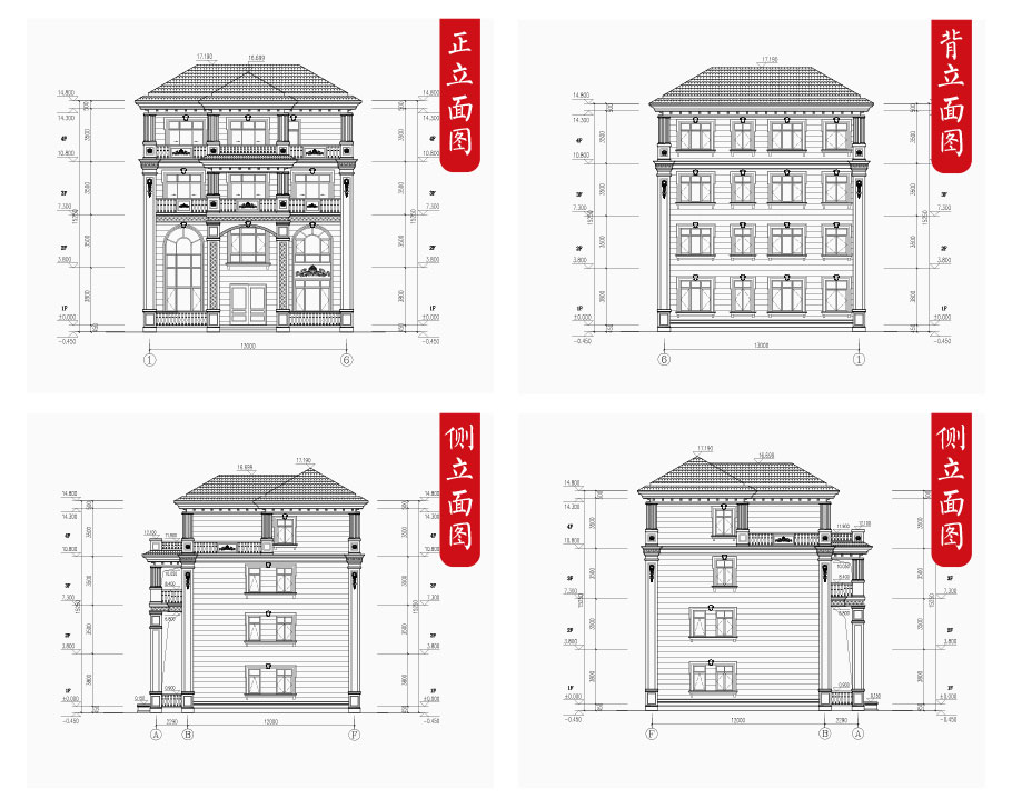 建筑立面圖:東立面圖,西立面圖,南立面圖,北立面圖,剖面圖;
