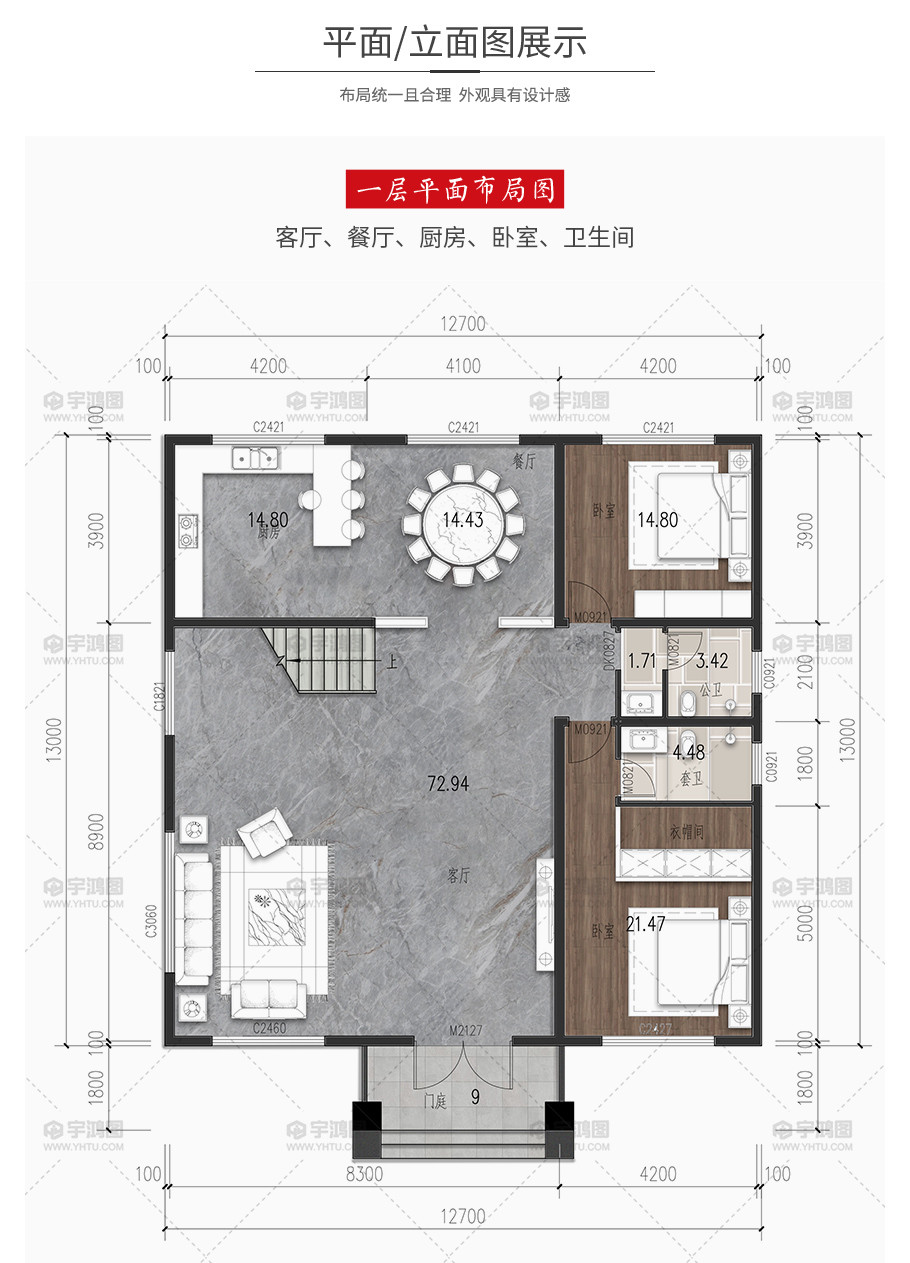 | 開間:12.7米 | 進深:13米 | 占地面積:165.1平方米 | 建筑面積:299.9平方米 |