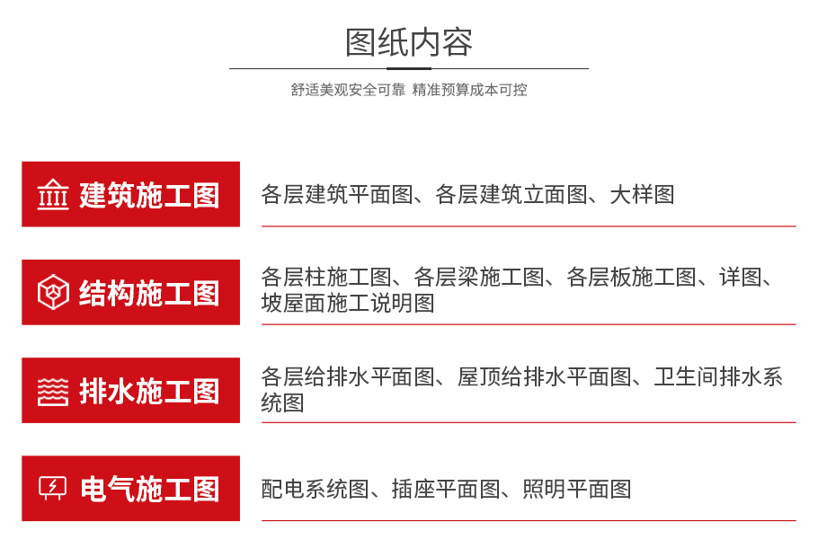 | 建筑圖: | 建筑平面圖:一層平面圖,二層平面圖,三層平面圖; 建筑立面圖:東立面圖,西立面圖,南立面圖,北立面圖,剖面圖; 大樣圖:樓梯詳圖,細部大樣,門窗大樣 |