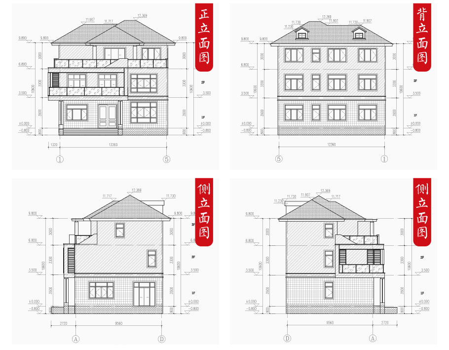 建筑立面圖:東立面圖,西立面圖,南立面圖,北立面圖,剖面圖;