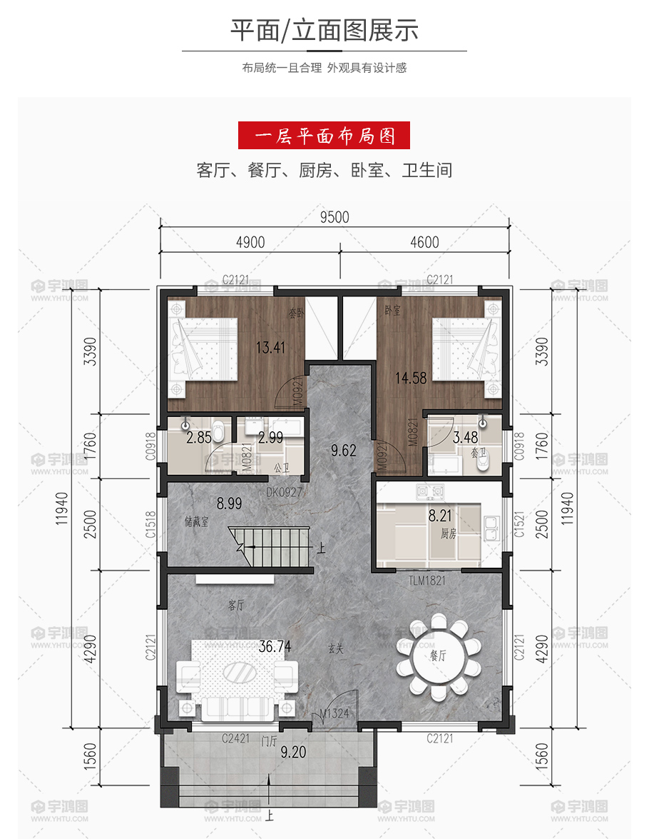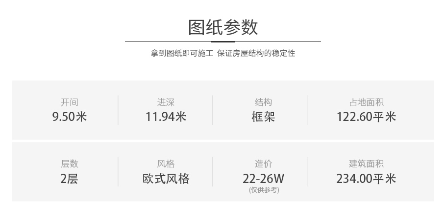 | 開間:9.5米 | 進深:11.94米 | 占地面積:122.6平方米 | 建筑面積:234平方米 |