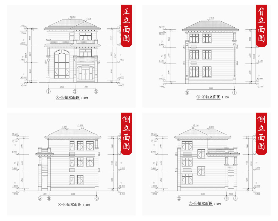 建筑立面圖:東立面圖,西立面圖,南立面圖,北立面圖,剖面圖;
