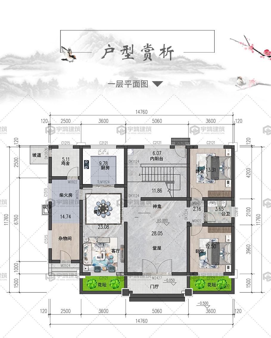 | 開間:14.7米 | 進深:11.7米 | 占地面積:131平方米 | 建筑面積:293.8平方米 |