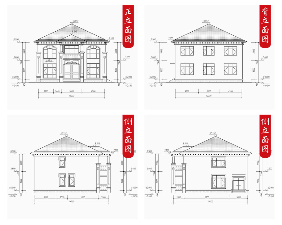 建筑平面圖:一層平面圖,二層平面圖; 建筑立面圖:東立面圖,西立面圖,南立面圖,北立面圖,剖面圖; 大樣圖:樓梯詳圖,細(xì)部大樣,門窗大樣 |