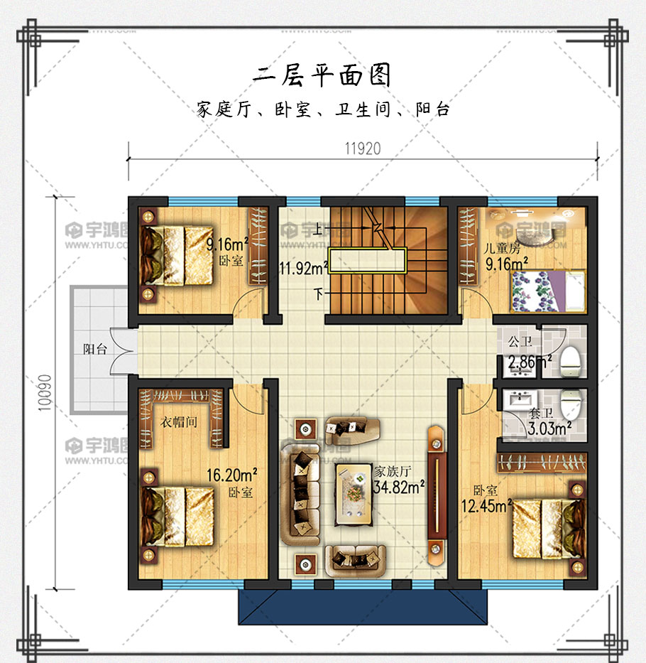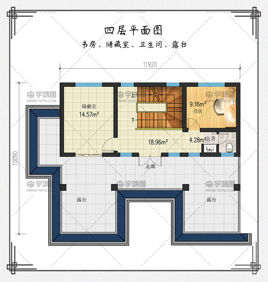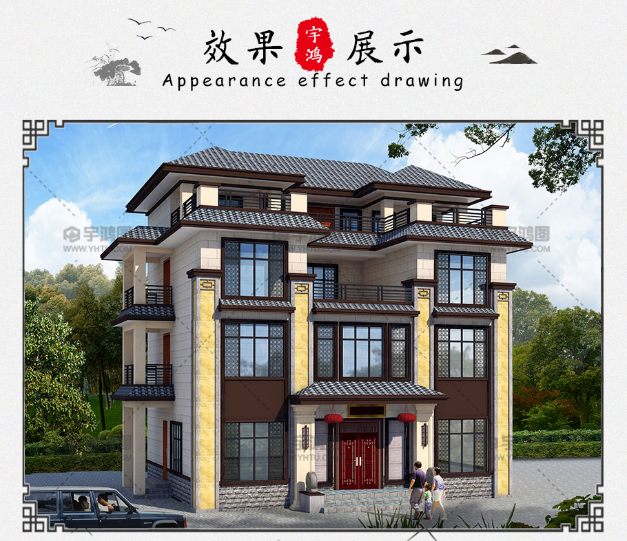戶型為12x10米四層中式農村別墅設計圖紙,豪華大氣帶堂屋,戶型設計精美闊氣,一二三層設有落地大窗,二三層四層分別有陽臺、大露臺,采光充足,室內敞亮。外立面色彩搭配富有質感,室內功能齊全,空間劃分合理,房間尺寸適宜,空間利用率高。