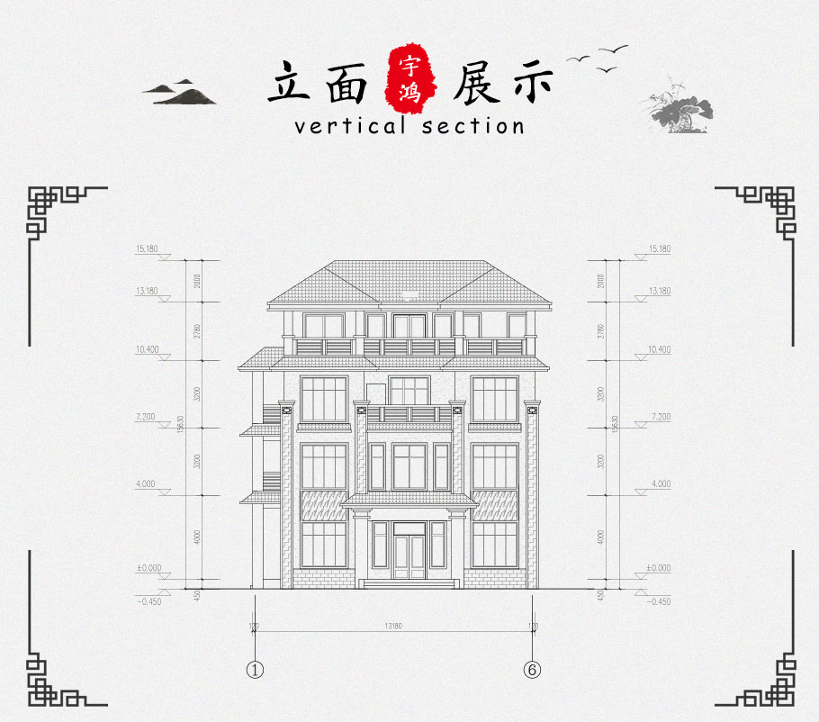 建筑立面圖:東立面圖,西立面圖,南立面圖,北立面圖,剖面圖;