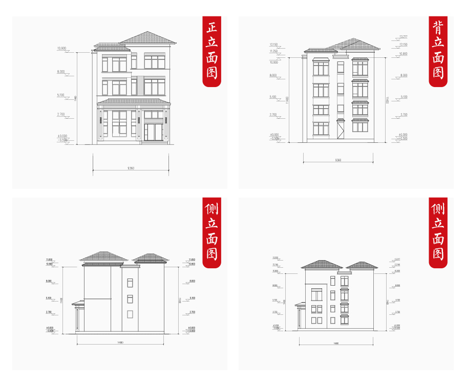 建筑立面圖:東立面圖,西立面圖,南立面圖,北立面圖,剖面圖;