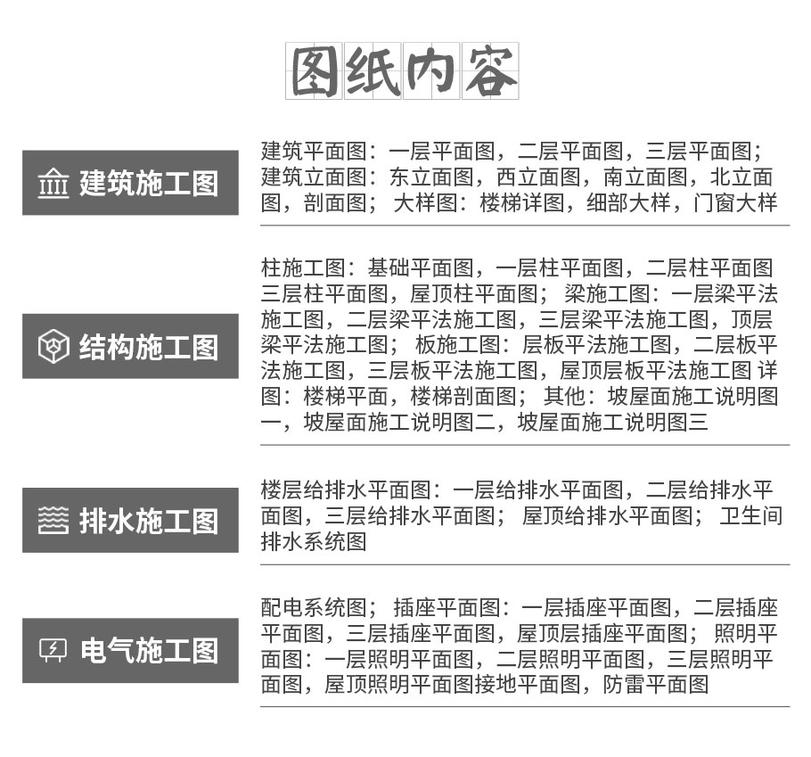 | 建筑圖: | 建筑平面圖:一層平面圖,二層平面圖,三層平面圖; 建筑立面圖:東立面圖,西立面圖,南立面圖,北立面圖,剖面圖; 大樣圖:樓梯詳圖,細(xì)部大樣,門窗大樣 |