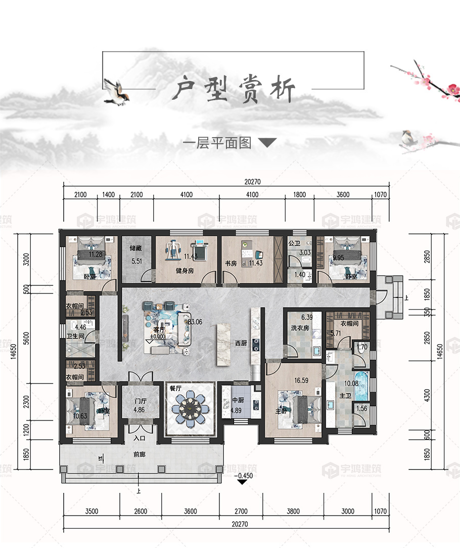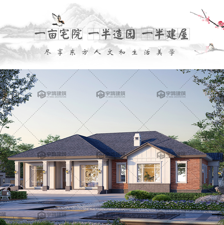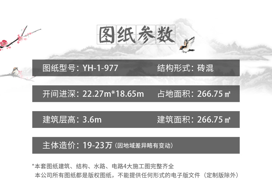 | 風格:新中式 | 層數:一層 | 結構形式:磚混結構 | 圖紙編號:YH-1-977 |