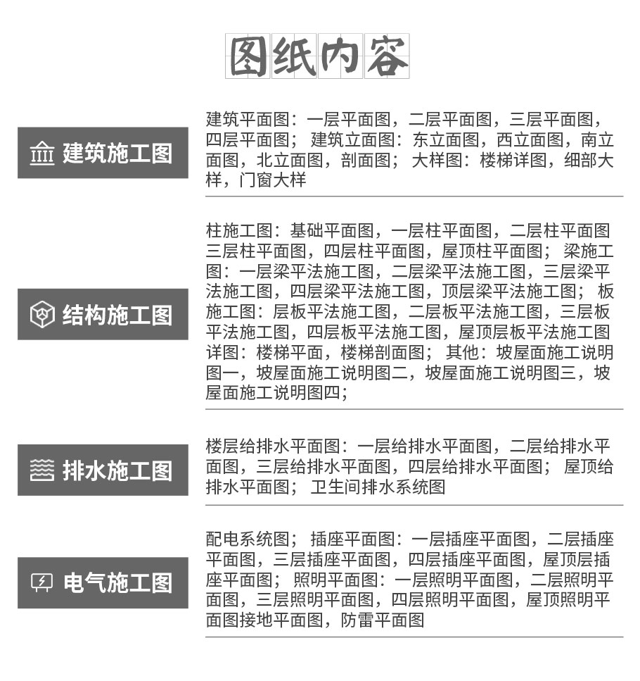 | 電氣圖: | 配電系統圖; 插座平面圖:一層插座平面圖,二層插座平面圖,三層插座平面圖,四層插座平面圖,屋頂層插座平面圖; 照明平面圖:一層照明平面圖,二層照明平面圖,三層照明平面圖,四層照明平面圖,屋頂照明平面圖接地平面圖,防雷平面圖 |