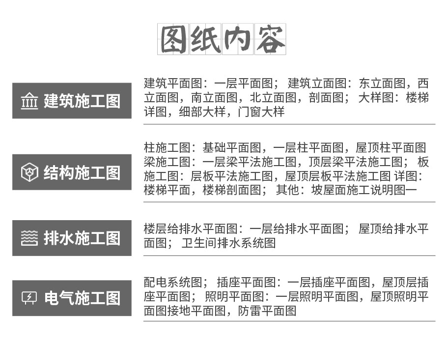 | 結構圖: | 柱施工圖:基礎平面圖,一層柱平面圖,屋頂柱平面圖; 梁施工圖:一層梁平法施工圖,頂層梁平法施工圖; 板施工圖:層板平法施工圖,屋頂層板平法施工圖 詳圖:樓梯平面,樓梯剖面圖; 其他:坡屋面施工說明圖一 |
