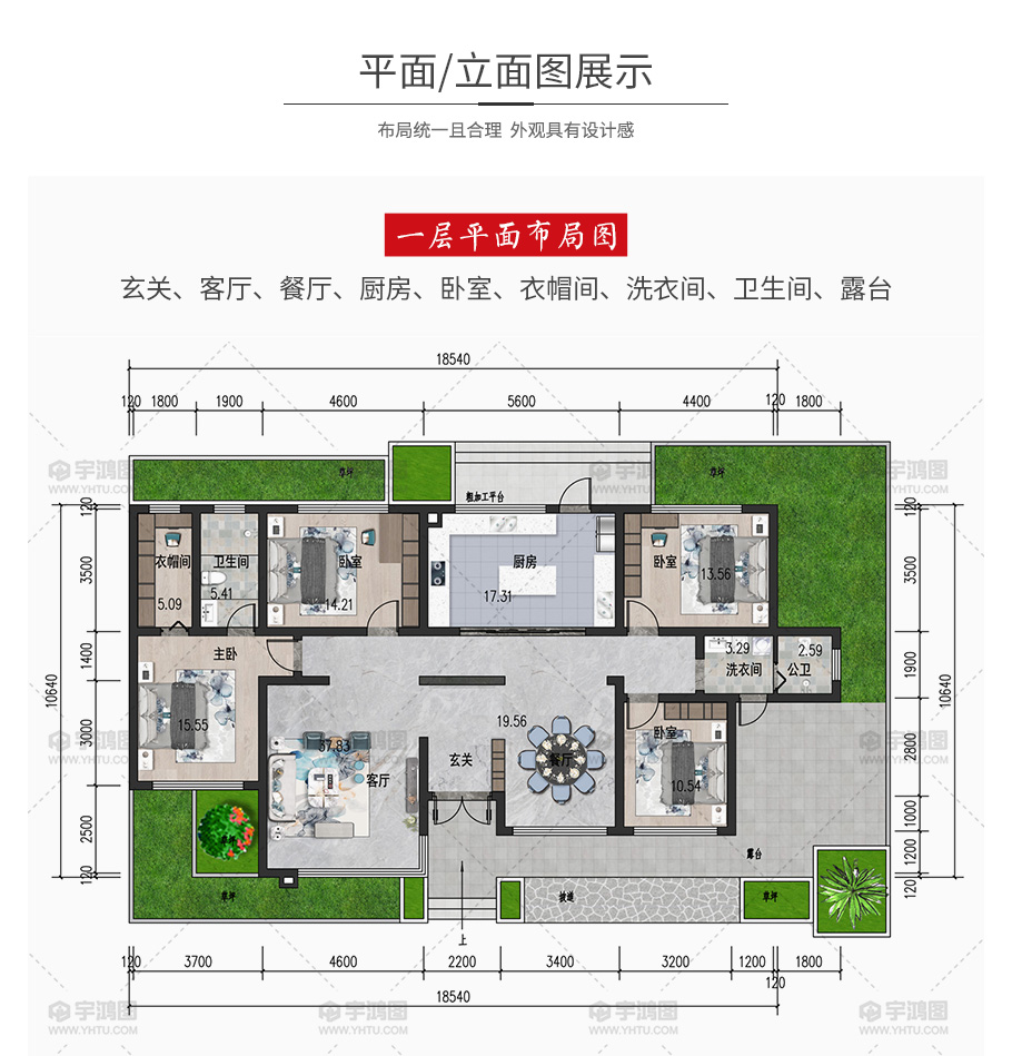 | 開間:18.54米 | 進深:10.64米 | 占地面積:182.05平方米 | 建筑面積:177.55平方米 |