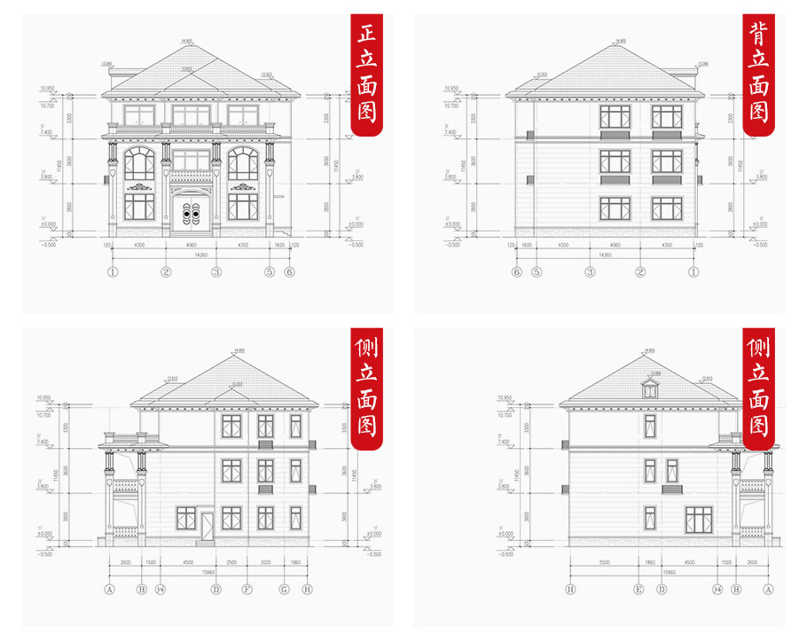 建筑平面圖:一層平面圖,二層平面圖,三層平面圖; 建筑立面圖:東立面圖,西立面圖,南立面圖,北立面圖,剖面圖; 大樣圖:樓梯詳圖,細部大樣,門窗大樣 |