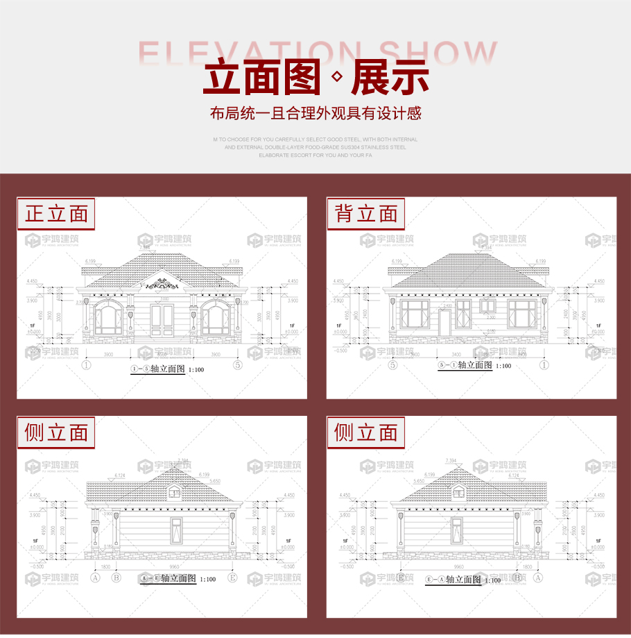 建筑平面圖:一層平面圖; 建筑立面圖:東立面圖,西立面圖,南立面圖,北立面圖,剖面圖; 大樣圖:樓梯詳圖,細部大樣,門窗大樣 |