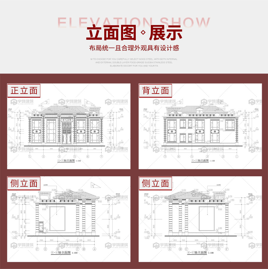 建筑平面圖:一層平面圖,二層平面圖; 建筑立面圖:東立面圖,西立面圖,南立面圖,北立面圖,剖面圖; 大樣圖:樓梯詳圖,細部大樣,門窗大樣 |