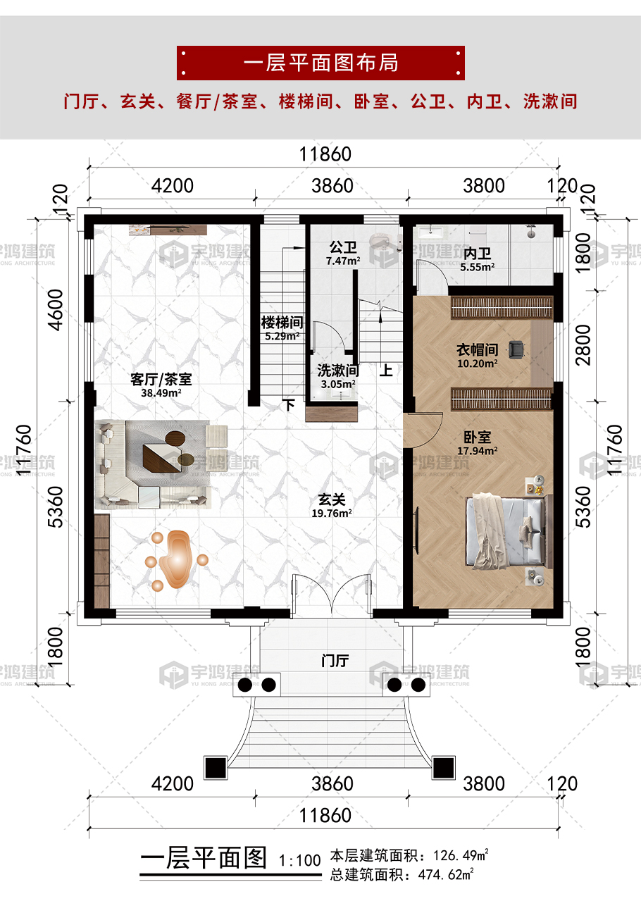 | 開間:11.86米 | 進(jìn)深:11.76米 | 占地面積:129.57平方米 | 建筑面積:474.62平方米 |