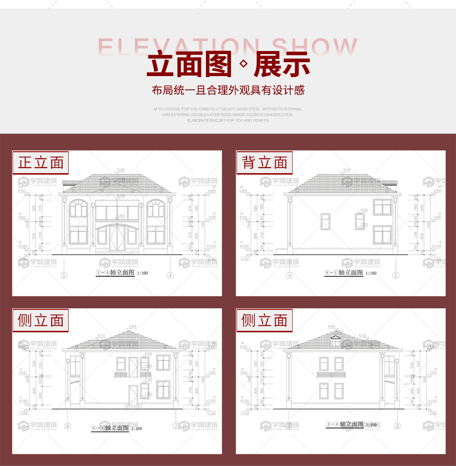 建筑平面圖:一層平面圖,二層平面圖; 建筑立面圖:東立面圖,西立面圖,南立面圖,北立面圖,剖面圖; 大樣圖:樓梯詳圖,細(xì)部大樣,門窗大樣 |