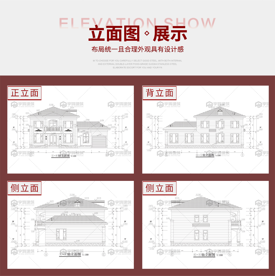 建筑平面圖:一層平面圖,二層平面圖; 建筑立面圖:東立面圖,西立面圖,南立面圖,北立面圖,剖面圖; 大樣圖:樓梯詳圖,細(xì)部大樣,門窗大樣 |
