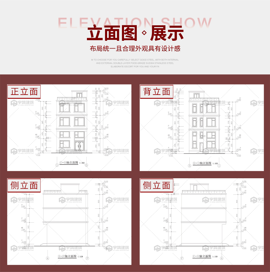 建筑平面圖:一層平面圖,夾層平面圖,二層平面圖,三層平面圖;屋頂層平面圖, 建筑立面圖:東立面圖,西立面圖,南立面圖,北立面圖,剖面圖; 大樣圖:樓梯詳圖,細(xì)部大樣,門窗大樣 |