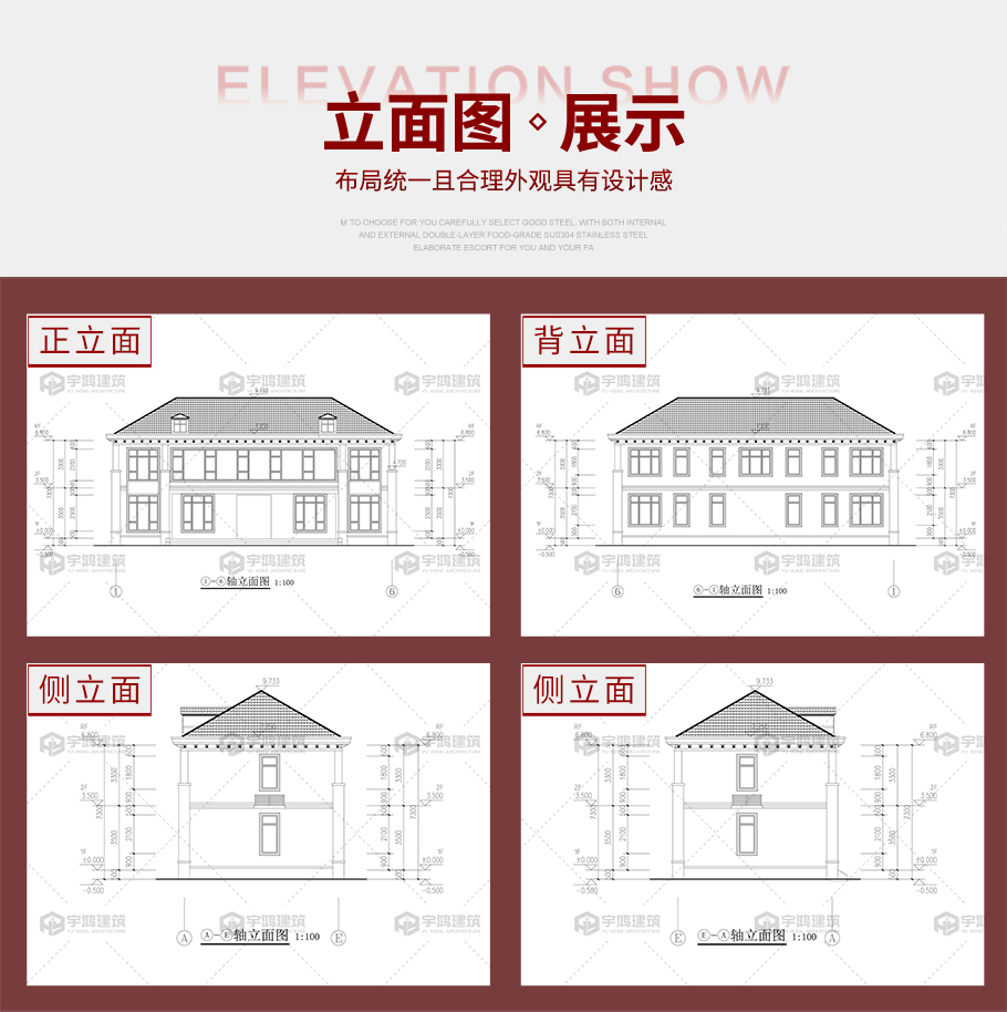 | 給排水圖: | 樓層給排水平面圖:一層給排水平面圖,二層給排水平面圖; 屋頂給排水平面圖; 衛生間排水系統圖 |