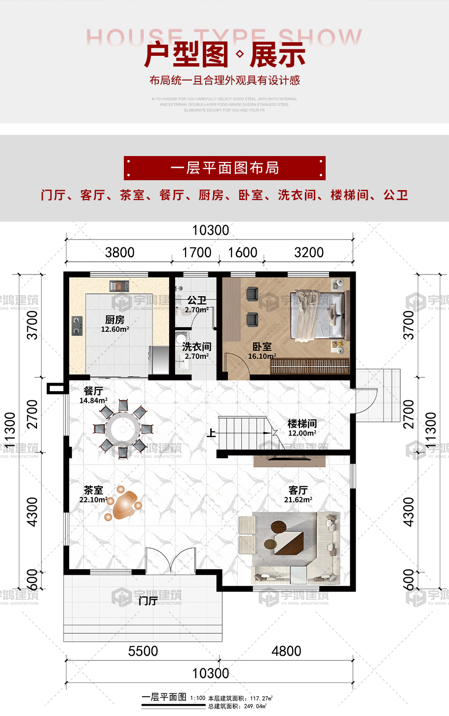 | 開間:10.3米 | 進深:11.3米 | 占地面積:117.27平方米 | 建筑面積:249.04平方米 |