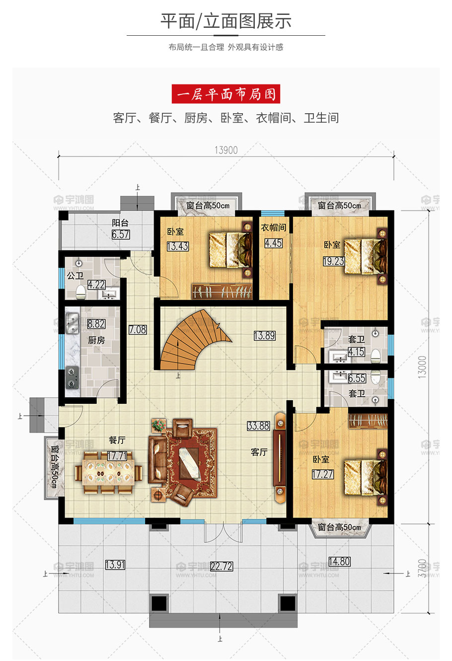 | 開間:13.9米 | 進深:16.7米 | 占地面積:180.7平方米 | 建筑面積:349平方米 |